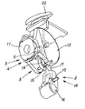 即ち、照明部1は光源5とこの光源5からの照明光を反射導光させて指向性を付与する反射導光部11と、更にこの照明光を透過させて散乱させたりや更に照明広角を広狭させる光透過部12などとから成り、これらを可動したり切り替えたり変化させたりすることでこの照明部1の照明範囲が頭部の傾動に伴ってこの傾動以上に下方に変化するように構成している。