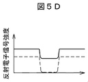 FIG. 5 shows an example of the difference in profile depending on the selection of signal electrons to be acquired. Here, a sample in which a deep hole or groove is formed is shown as an example. When the sample is irradiated with an electron beam, secondary electrons and reflected electrons are emitted at various elevation angles. Since secondary electrons are low in energy, they are greatly affected by an external electric field as shown in FIG. 5A. In particular, under the voltage condition of the retarding method used to improve the resolution, the secondary electrons are pulled up from the sample by the retarding electric field. Detected. In the line profile, as shown in FIG. 5B, a peak is observed at the end portion of the hole due to the edge effect in which many secondary electrons are emitted at the edge portion of the pattern. This peak is called a white band, and the size of the hole is measured using the white band. The contrast of the top part and the bottom part of the pattern is observed depending on the secondary electron emission efficiency of the material of each part. Since the energy of the reflected electrons is sufficiently high, the high-angle component of the reflected electrons generated at the bottom cannot collide with the side surface before being pulled out of the hole by the retarding electric field and escape from the hole (FIG. 5C). On the other hand, all the elevation angle components of the reflected electrons emitted from the top part can be emitted out of the sample. When an image is acquired based on the backscattered electron signal obtained in this state, a contrast according to the difference in the backscattered electron emission efficiency between the top portion and the bottom portion and the difference in the detection rate is observed (solid line in FIG. 5D). Here, if the reflected electrons are selected and detected by removing the angle component that is not detected at the bottom part, the influence of the difference in detection rate due to the sample structure can be removed, and the pure material contrast between the top part and the bottom part can be reduced. Can be obtained. Alternatively, when only an elevation angle component that is not detected in the bottom portion is acquired to create an image, an image in which the contrast between the top portion and the bottom portion is enhanced can be obtained (broken line in FIG. 5D). Furthermore, when there is a structure in the bottom portion and it is desired to examine the pattern shape, it is possible to emphasize and observe the pattern shape of the bottom portion by detecting only a component having a slight angle. As described above, it is possible to enhance the material contrast and to clarify the pattern shape by selecting and detecting the reflected electrons at a specific angle. That is, it has been found that it is effective to arbitrarily select and detect the reflected electron emission angle depending on the sample structure to be observed and the diversification of observation purposes.