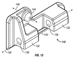 図12および13を参照すると、フィンガーまたはフランジ部132は、咬持部材側壁134から横方向内向きに延在し、そこを通って縦方向に延在する穴136を画定する。咬持部材110、112は、横方向に重なり合うフランジ部132、およびピン138を受容するよう整列し、かつ枢動軸140を画定する穴136により組み立てられてもよい。この点について、左側および右側の咬持部材110、112は、ピン138ならびに軸140を中心として相互に対して枢動してもよい。咬持頂上部142は、咬持部材110、112が軸142を中心として枢動する時、頂上部142は、棒100をその間に保持、咬持、または固定するために、相互に向かって、かつ相互から離れるように移動し得るように、各々の咬持部材110、112の下縁部に沿って画定してもよい。一変形例によると、棒100は、咬持部材110、112の一部たりとも棒100の半径を超えて延在または突出しないように、その上部周囲で、棒100の輪郭内の咬持部材110、112と咬持または保持されてもよい。一実施形態では、棒100は、略円形断面を有する略円筒状であり、咬持部材110、112は、棒の中線または直径から離間した棒の上部に棒100を係合する。この点について、咬持部材110、112が、棒100を咬持または保持するために咬持位置にある時、それらは、概して、棒の直径よりも小さい距離で離間される。かかる設計の結果として、棒100は、咬持部材をその中に進入させるためのさらなる空隙または空間を必要とすることなく、棒咬持位置で、アンカー受容器部材内に直接装荷されてもよいことが理解されるかもしれない。かかる特性が、咬持部材110、112を収容するために、受容器部分が特に大きさを決められ、かつ寸法決定され、ならびに/または改良されなければならないという要件を必要とすることなく、伝来のアンカーまたはネジの使用を容易にするのに有利である場合があることを、当業者は理解するかもしれない。