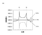 この原因について図8から図11を用いて説明する。まず、図8、図9は、ゲート電極領域の半導体表面(具体的にはAlGaN)から基板方向へ0.5nmの深さの位置(図1の一点鎖線Ps参照)における結晶歪みのYY成分(図1における垂直方向(紙面上下方向)への半導体結晶(具体的にはAlGaN)の歪み。符号は、プラスのときには結晶が伸びる方向で、マイナスのときには結晶が縮む方向、を各々指す)についてのデバイスシミュレーションによる計算結果である。図8は、開口部が直方体状輪郭面を持つ場合の結果を示している。また、図9は、開口部が台形四角柱状輪郭面を持つ場合(開口部の輪郭線の半導体表面に対する傾斜角度が45度のとき)の結果を示している。なお、図8、図9のいずれの図においても、位置参照用の一点鎖線S、および一点鎖線Dを合わせて記載した。一点鎖線Sは、ソース電極側のゲート開口端部の位置を示し、一点鎖線Dはドレイン電極側のゲート開口端部の位置を示したものである(一点鎖線S、一点鎖線Dについては、以下に説明する図10、図11においても同様)。 The cause of this will be described with reference to FIGS. 8 to 11. First, FIGS. 8 and 9 show the YY component of crystal strain (see the one-point chain line Ps in FIG. 1) at a depth of 0.5 nm from the semiconductor surface (specifically, AlGaN) in the gate electrode region toward the substrate. Distortion of a semiconductor crystal (specifically, AlGaN) in the vertical direction (vertical direction on the paper surface) in FIG. 1. The reference numerals indicate the direction in which the crystal expands when it is positive, and the direction in which the crystal shrinks when it is negative). This is the calculation result by device simulation. FIG. 8 shows the result when the opening has a rectangular parallelepiped contour surface. Further, FIG. 9 shows the result when the opening has a trapezoidal square columnar contour surface (when the inclination angle of the contour line of the opening with respect to the semiconductor surface is 45 degrees). In both FIGS. 8 and 9, the alternate long and short dash line S for position reference and the alternate long and short dash line D are shown together. The alternate long and short dash line S indicates the position of the gate opening end on the source electrode side, and the alternate long and short dash line D indicates the position of the gate opening end on the drain electrode side (the alternate long and short dash line S and the alternate long and short dash line D are as follows. The same applies to FIGS. 10 and 11 described in FIG.