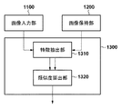 図2における識別処理(S1105)についての概要を述べる。図3は、画像識別部1300を構成する要素のブロック図を示す。画像識別部1300は、特徴抽出部1310と、類似度算出部1320とを備えている。まず、特徴抽出部1310が、取得した入力画像と登録画像とのそれぞれから、個人を識別しうる顔の特徴を示す特徴量を抽出する。次に、類似度算出部1320が、抽出された特徴量同士を比較し、入力画像と登録画像とのそれぞれの顔画像が同一人物であるかどうかを表す値である類似度を算出する。