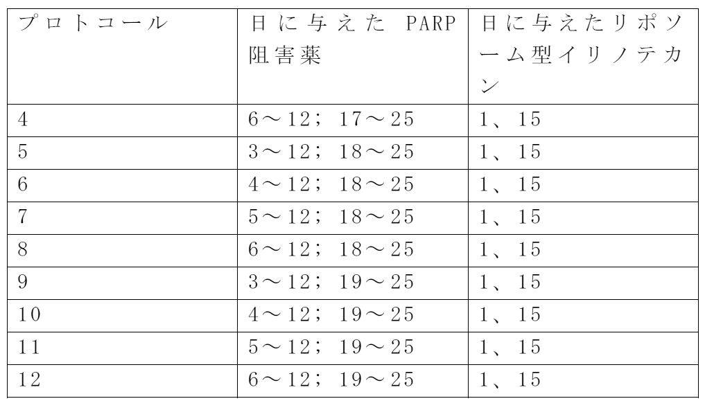 本開示は、末梢毒性が低減した、腫瘍にTop1阻害薬及びPARP阻害薬の組み合わせを投与する方法を提供する。一態様では、癌、例えば、悪性腫瘍を処置する方法が提供され、この方法は、Top1阻害薬及びPARP阻害薬の同時投与の1つ以上の例を含む治療レジメンを含み、同時投与の各例は、(a)有効量のイリノテカンリポソーム製剤を、それを必要とする患者に投与すること;及び(b)Top1阻害薬の投与が完了した後に、患者に有効量のPARP阻害薬を投与することを含み、PARP阻害薬は、Top1阻害薬及びPARP阻害薬の同時投与と比較して、末梢毒性の低減を可能にする間隔の後に患者に投与される。 The present disclosure provides a method of administering a combination of a Top1 inhibitor and a PARP inhibitor to a tumor with reduced peripheral toxicity. In one aspect, a method of treating a cancer, eg, a malignant tumor, is provided, the method comprising a therapeutic regimen comprising one or more examples of co-administration of a Top1 inhibitor and a PARP inhibitor, each example of co-administration. To administer an effective amount of an irinotecan liposome preparation to a patient in need thereof; and (b) to administer an effective amount of a PARP inhibitor to a patient after the administration of the Top1 inhibitor is completed. The PARP inhibitor is administered to the patient after an interval that allows reduction of peripheral toxicity as compared to co-administration of the Top1 inhibitor and the PARP inhibitor.