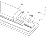各シリンドリカルレンズ21のY軸方向に直交する断面は、U字状である。よって、各シリンドリカルレンズ21は、断面がU字状の曲面と、平面状の底面とを有している。各シリンドリカルレンズ21の底面は各光源10に対向している。すなわち、各シリンドリカルレンズ21の底面は-Z軸方向を向いている。各シリンドリカルレンズ21の曲面は、+Z軸方向側を向いている。各シリンドリカルレンズ21の曲面は、X軸方向において曲率半径を有している。各シリンドリカルレンズ21の曲面は、Y軸方向において曲率半径を有していない。