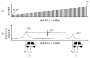 (14)前記出射装置は、前記出射部に前記光を出射させる出射制御手段と、前記受光部によって受光される前記光を含む信号を、等価時間サンプリング法によるサンプリング間隔でサンプリングする等価時間サンプリング手段とを備え、前記出射制御手段は、前記光を出射してから前記等価時間サンプリング手段によってサンプリングされるまでの時間に応じて、出射する前記光の輝度を変化させるとよい。例えば、出射装置から第二車両までの距離が近ければ近いほど、受光部に受光される反射光の輝度が大きくなりやすい。また、例えば、発光側のレンズの特性、又は、受光側のレンズの特性等によって、出射装置から第二車両までの距離が、所定範囲の距離である場合に、受光部に受光される反射光の輝度が大きくなる場合がある。受光部によって受光される反射光の輝度が大きくなると、受光部によって受光された反射光に基づく電圧を、アンプ回路等で増幅する場合に、アンプ回路が飽和する可能性がある。このため、アンプ回路の飽和した後に、正常な状態に戻るのに時間を要し、第二車両の検出精度が低下する可能性がある。 (14) The emission device includes emission control means for causing the emission section to emit the light, and equivalent time sampling means for sampling a signal containing the light received by the light receiving section at sampling intervals according to an equivalent time sampling method. and, preferably, the emission control means changes the brightness of the emitted light according to the time from the emission of the light to the sampling by the equivalent time sampling means. For example, the closer the distance from the emission device to the second vehicle, the higher the brightness of the reflected light received by the light receiving unit. Further, for example, when the distance from the emission device to the second vehicle is within a predetermined range due to the characteristics of the lens on the light-emitting side or the characteristics of the lens on the light-receiving side, the reflected light is received by the light-receiving unit. brightness may increase. If the brightness of the reflected light received by the light-receiving unit increases, the amplifier circuit may saturate when the voltage based on the reflected light received by the light-receiving unit is amplified by an amplifier circuit or the like. For this reason, after the amplifier circuit is saturated, it takes time to return to a normal state, and there is a possibility that the detection accuracy of the second vehicle is lowered.