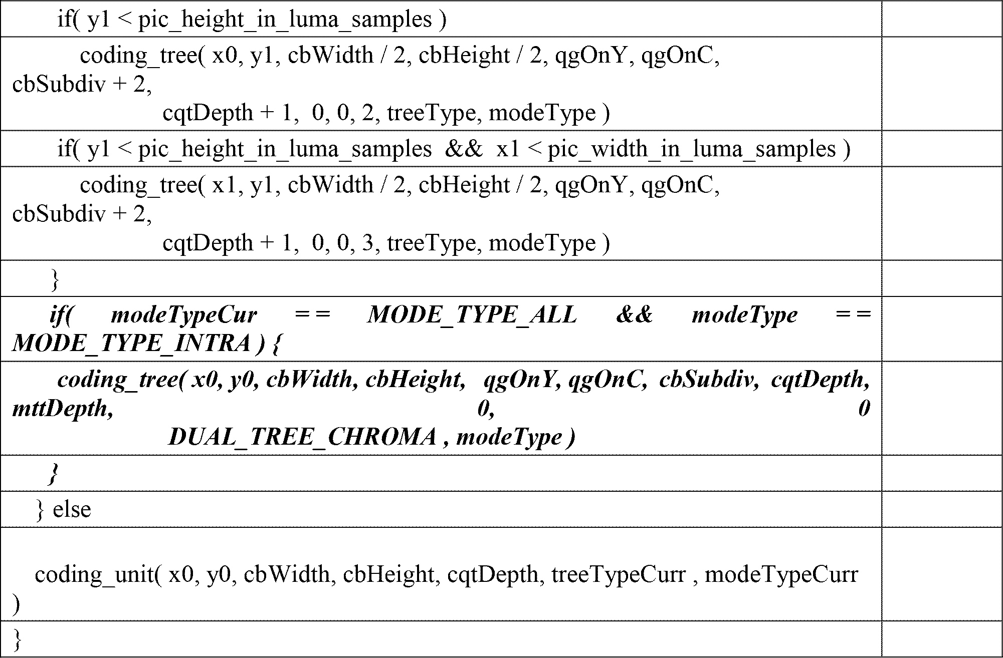 さらに別の例示的側面では、ビデオ処理の別の方法が開示される。本方法は、ビデオのビデオ・ピクチャーのビデオ領域のクロマ・ブロックと、該ビデオのコーディング表現との間の変換を規則に従って実行することを含む。前記規則は、サイズM×Nを有する前記クロマ・ブロックが、シングルツリー分割が使用される場合に、イントラコーディングモードを使用して前記コーディング表現において表現されることが許されないことを規定し、MおよびNはそれぞれ前記クロマ・ブロックの幅および高さを示す整数であり、前記イントラコーディングモードは、前記ビデオ・ピクチャーの前にコーディングされたビデオ領域に基づいて前記クロマ・ブロックをコーディングすることを含む。 In yet another exemplary aspect, another method of video processing is disclosed. The method includes performing a rule-based conversion between chroma blocks of a video region of a video picture of a video and a coded representation of the video. The rule specifies that the chroma block with size M×N is not allowed to be represented in the coded representation using intra- coding mode when single-tree partitioning is used, and M and N are integers indicating the width and height of the chroma block, respectively, and the intra- coding mode includes coding the chroma block based on a previously coded video region of the video picture. .