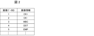 教師データ生成部63は、教師データ生成用に入力された画像データから、第1の教師データおよび第2の教師データを生成する。詳細には、教師データ生成用に入力される画像データは、予め、その画像データが、複数種類の細胞のうちの何れのものであるか、または非細胞であるかの情報と関連付けがなされている。教師データ生成部63は、画像データに関連付けされた当該情報を参照して、第1の教師データおよび第2の教師データを生成する。画像データと当該情報との関連付けは、画像データと当該情報との対応関係を示すテーブルである第1のテーブルを作成しておき、画像データとともに当該第1のテーブルを入力し、それを参照するものである。しかしながら画像データと当該情報との関連付けはテーブルを用いる場合に限らず、例えば、画像データのメタデータとして当該情報を含ませるものであってもよい。第1のテーブルの一例を図2に示す。図2に示すテーブルでは、各画像データに対して、後述する「CK+」、「CK-」、「WBC」、「DST」および「EMP」の何れかの情報が関連付けされている。