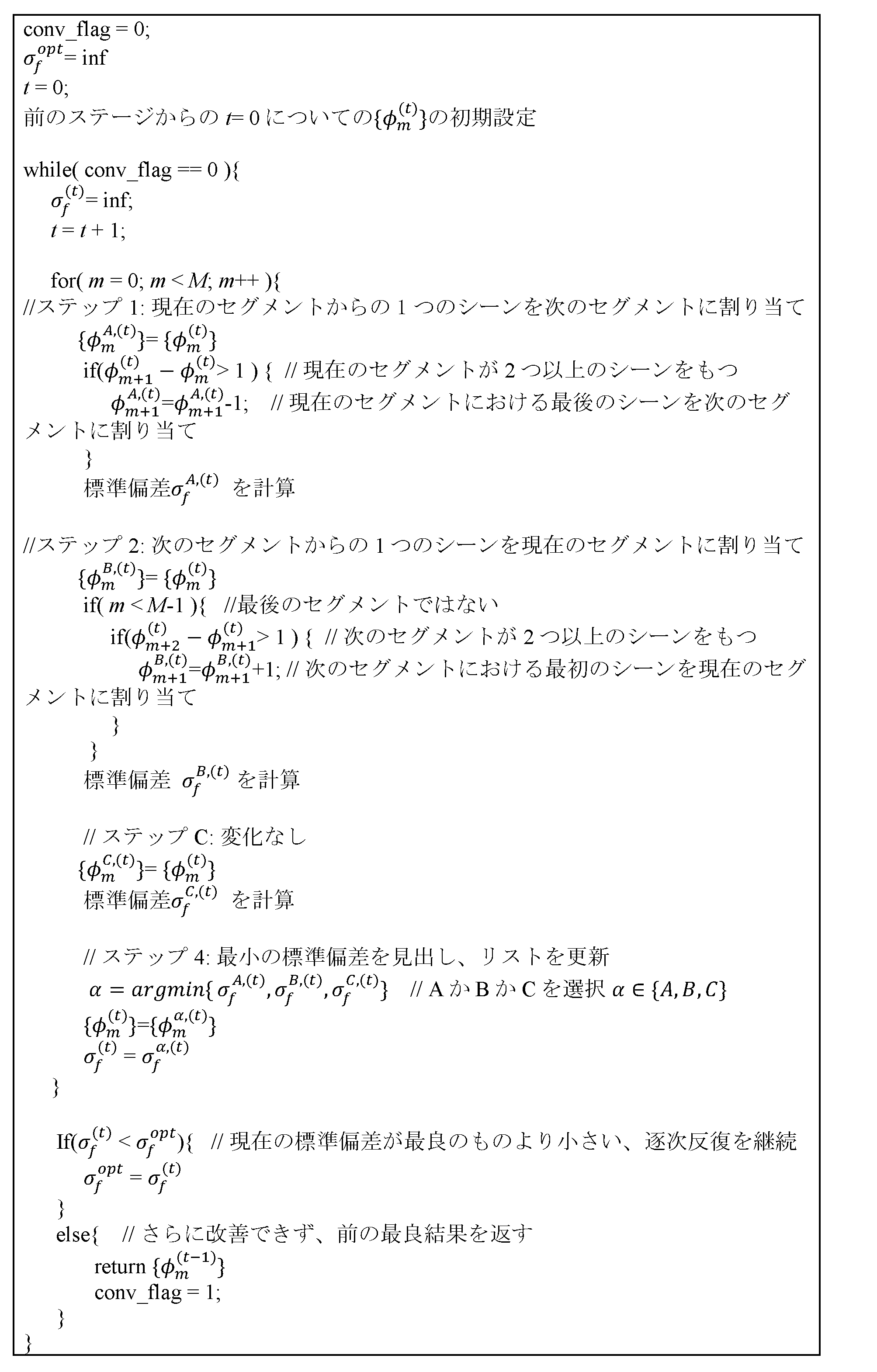 別の実施形態では、M個の計算ノードのうちのあるノードについて、そのノード内のプロセッサは、シーンからセグメントへの割り当てに従って、そのノードに割り当てられたシーンにアクセスする段階であって、該シーンは、高ダイナミックレンジ(HDR)フレームのシーケンスと、対応する標準ダイナミックレンジフレーム(SDR)のシーケンスとを含む、段階と、シーン・ベースの前方再整形関数およびシーン・ベースの後方再整形関数を使用して出力ビットストリームおよび対応する再整形メタデータとを生成する段階とを実行する。 In another embodiment, for a node of the M computational nodes, a processor in the node performs the steps of accessing a scene assigned to the node according to a scene-to-segment assignment, the scene including a sequence of high dynamic range (HDR) frames and a corresponding sequence of standard dynamic range (SDR) frames, and generating an output bitstream and corresponding reshaping metadata using a scene-based forward reshaping function and a scene-based backward reshaping function.
