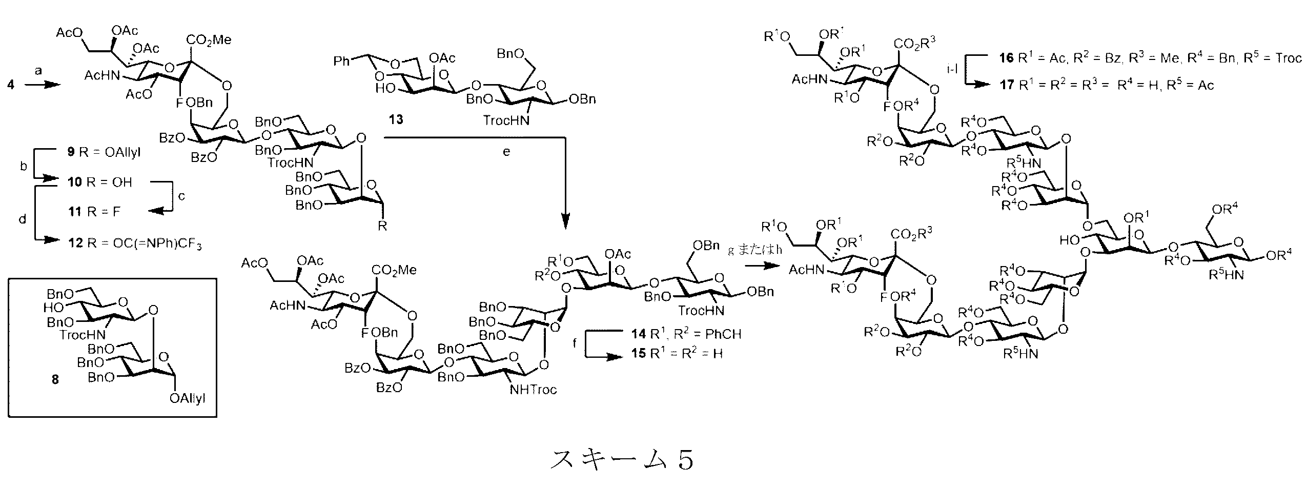 スキーム5を参照すると、NIS/TMSOTfを用いて3Fax-Neu5Ac-二糖ドナー4をアクセプター(8)に結合させて9を得た。次にアノマー位置にあるO-allyl基をAcOH/NaOAc中のPdCl2による異性化によって除去し、アノマーのヒドロキシル基(10)をさらにフルオリド(11)およびイミデート(12)に変換した。Cp2HfCl2/AgOTf条件を用いた3Fax-Neu5Ac末端フルオリドドナー(11)によるO-3におけるコア二糖(13)のグリコシル化によりヘキサ糖14を85%の収率で得た。ベンジリデン基の除去後に、15をO-6位においてグリコシル化して、優れた位置選択性およびα立体選択性により所望の十糖(16)を70%の収率で得た。本発明者らは、N-フェニルトリフルオロアセトイミデートドナー(12)を用いたTfOH促進グリコシル化も試験したが、これにより不十分な収率の生成物が得られた。次に、以下の一連の工程:(a)エステルおよびNHTroc基を除去するためのLiOHによる鹸化、(b)遊離アミンおよびアルコールのアセチル化、(c)ナトリウムメトキシドによるOAc基の除去、および(d)MeOH/水/HCO2H混合物中のPd/CによるO-ベンジル基の水素化分解4bに従って、完全に脱保護されたグリカン(17)を40%の全収率で得た。