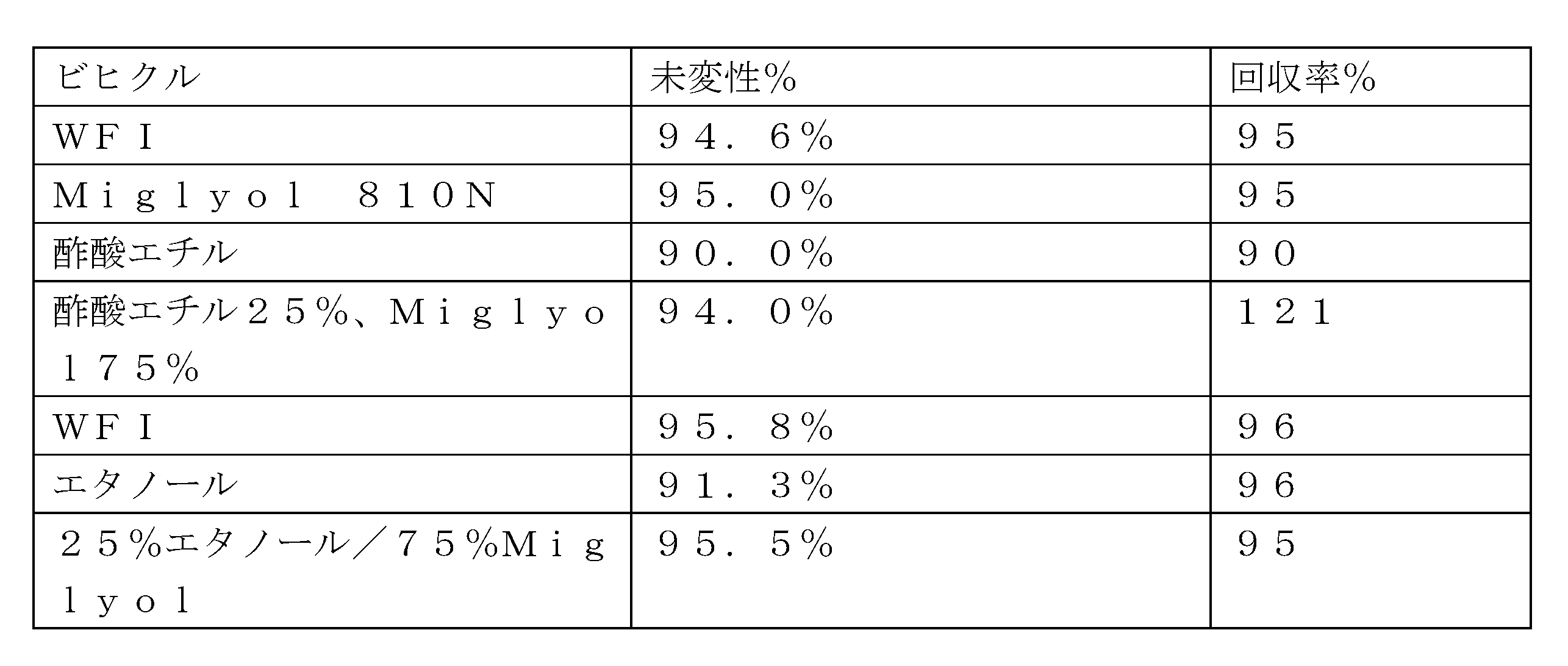 本発明の別の例示的な実施形態では、高濃度タンパク質製剤は、(i)少なくとも約200mg/mLの治療用タンパク質と、(ii)約25%~約75%のMiglyol 812N、及び(iii)約25%~約75%のエタノールと、を含む。 In another exemplary embodiment of the invention, the high concentration protein formulation comprises (i) at least about 200 mg/mL of a therapeutic protein, (ii) about 25% to about 75% Miglyol 812N, and (iii) about 25% to about 75% ethanol.