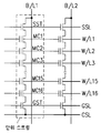 도 7은 본 발명에 의한 NAND형 플래쉬 EEPROM 장치의 셀 어레이의 등가 회로도이다. 도 7을 참조하면, 본 발명에 의한 NAND형 플래쉬 EEPROM 셀 어레이는 단위 스트링을 선택하기 위한 선택 트랜지스터(SST)와 그라운드를 선택하기 위한 선택 트랜지스터(GST)의 사이에 플로팅 게이트와 컨트롤 게이트가 적층된 구조의 메모리 셀 트랜지스터(MC1, …, MC16)들이 다수개 직렬로 연결되어 하나의 스트링을 구성한다. 상기 스트링은 비트라인(B/L1, B/L2, …)에 다수개 병렬로 연결되어 하나의 블록을 구성하고, 상기 블록은 비트라인 콘택을 중심으로 대칭적으로 배치된다. 상기 트랜지스터들은 행과 열의 매트릭스 형태로 배열되고, 동일 열들에 배열된 스트링 선택 트랜지스터(SST) 및 그라운드 선택 트랜지스터(GST)의 게이트는 각각 스트링 선택 라인(SSL) 및 그라운드 선택 라인(GSL)과 접속된다. 또한, 동일 열들에 배열된 메모리 셀 트랜지스터(MC1, …, MC16)의 게이트는 대응되는 다수의 워드라인(W/L1, …, W/L16)에 접속된다. 그리고, 상기 스트링 선택 트랜지스터(SST)의 드레인에는 비트라인(B/Lj)(여기서 "j"는 1,2,3등의 자연수이다)이 연결되고, 그라운드 선택 트랜지스터(GST)의 소오스에는 공통 소오스 라인(CSL)이 연결된다.7 is an equivalent circuit diagram of a cell array of a NAND type flash EEPROM device according to the present invention. Referring to FIG. 7, in the NAND type flash EEPROM cell array according to the present invention, a floating gate and a control gate are stacked between a selection transistor SST for selecting a unit string and a selection transistor GST for selecting ground. A plurality of memory cell transistors MC1, ..., MC16 having a structure are connected in series to form one string. The strings are connected in parallel to a plurality of bit lines (B / L1, B / L2, ...) to form a block, and the blocks are symmetrically arranged around the bit line contacts. The transistors are arranged in a matrix of rows and columns, and gates of the string select transistor SST and the ground select transistor GST arranged in the same columns are connected to the string select line SSL and the ground select line GSL, respectively. . Further, the gates of the memory cell transistors MC1, ..., MC16 arranged in the same columns are connected to the corresponding plurality of word lines W / L1, ..., W / L16. A bit line B / Lj (where "j" is a natural number such as 1, 2, 3, etc.) is connected to the drain of the string select transistor SST, and a common source is connected to the source of the ground select transistor GST. The line CSL is connected.