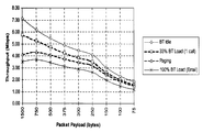 도 4는 무선랜 시스템과 블루투스 시스템이 공존하는 경우 무선랜 시스템의 데이터 처리효율(throughput)의 변화를 나타낸 도면으로 짐 질런(Jim Zyren)이 1999년 6월에 블루투스 '99에서 발표한 논문에 개제되어 있다. 우선, 무선랜 시스템에서 패킷 페이로드(payload)가 1500바이트(byte)인 경우를 보면 블루투스 시스템이 동작하지 않는 경우, 즉 무선랜 시스템만 존재할 경우 처리효율이 7Mbps 이상이다. 그러한 하나의 블루투스 단말이 E-mail을 전송하기 위해 100%의 로드가 걸린 경우에는 그 처리효율이 약 3.5Mbps로 50%정도 감소되는 것을 볼 수 있다.FIG. 4 is a diagram illustrating a change in data throughput of a WLAN system when a WLAN system and a Bluetooth system co-exist. Jim Zyren published in a paper published by Bluetooth '99 in June 1999. It is. First, when the packet payload is 1500 bytes in the WLAN system, when the Bluetooth system does not operate, that is, when only the WLAN system exists, the processing efficiency is 7 Mbps or more. When one such Bluetooth terminal takes 100% of the load to send an E-mail, the processing efficiency is reduced by about 50% to about 3.5Mbps.