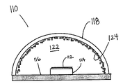 에폭시 또는 다른 충전 물질로 분산되는 것 보다 렌즈(118)의 내측면에 인광물질 코팅(124)을 제공하는 것이 LED 방출의 보다 더 균일하고 효율적인 변한을 제공한다. 하나의 장점은 콘트롤된 두께의 균일한 코팅이 적용된다는 것이다. 이러한 하나의 이점은 코팅 두께가 최적 변환 효율과 UV 방출 칩이 사용되는 경우 최소량의 인광물질을 사용하는 콘트롤을 통한 UV 블리드를 위해 정밀하게 콘트롤될 수 있는 것이다. 이것은 종래 장치에서 인광물질의 불균일 분산으로부터 초래되는 컬러 링(color ring)의 입사 없이 균일한 발광에 도움을 준다. 다른 이점은 인광물질이 LED에 의해 발생된 열을 제거하고 변환효율을 증가시키는 것이다. 물론, 인광물질층은 렌즈물질 안쪽에 위치되거나 그 위에 위치된 다른 물질의 코팅을 갖고, 그러한 배열은 본 발명에 의해 고려될 수 있다.Providing the