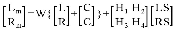 여기서, Lm과 Rm은 다운 믹싱된 결과인 스테레오 신호의 왼쪽 성분과 오른쪽 성분을 각각 나타내고, W는 가중치로서 사전에 결정될 수도 있고 가변될 수 있으며, Fi0과 Fi1은 입력단자 IN2를 통해 입력되는 다채널 오디오 신호에 포함된 성분들중 비 서라운드 성분을 나타내고, Sj0과 Sj1은 다채널 오디오 신호에 포함된 성분들중 서라운드 성분을 나타내고, Nf는 비 서라운드 성분에 포함된 채널의 개수를 나타 내고, Ns는 서라운드 성분에 포함된 채널의 개수를 나타내고, Fi0과 Si0 에서 '0'은 왼쪽(L:Left)[혹은 오른쪽(R:Right)] 성분을 나타내고, Fi1과 Si1에서 '1'은 오른쪽(R)[혹은 왼쪽(L)] 성분을 나타내고, Hj는 공간 정보를 나타내는 공간 필터의 전달 함수를 나타낸다.Here, L m and R m represent the left and right components of the stereo signal, which are the result of downmixing, respectively, W may be predetermined or variable as a weight, and F i0 and F i1 may be input through the input terminal IN2. S j0 and S j1 represent a surround component among the components included in the input multi-channel audio signal, and S f represents a surround component among the components included in the multi-channel audio signal, and N f represents a channel of the channel included in the non-surround component. N s represents the number of channels included in the surround component, '0' represents the left (L: Left) (or right (R: Right)) component of F i0 and S i0 , and F i1. In S i1 , '1' represents a right (R) (or left (L)) component, and H j represents a transfer function of a spatial filter representing spatial information.