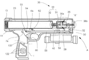 상기 액분사부재 동작수단(A)은 노즐(36)의 상부에 일측이 연결되고, 타측이 힌지(52)로써 회동 가능하게 고정된 상부회동레버(50)와; 상부회동레버(50)의 타측을 밀어 회동시키도록 일측이 외부몸체(12) 내부에 고정된 가이드(53)에 안내되고, 타단이 힌지(54)로써 방아쇠(60)의 안내장공(55)에 회동 가능하게 연결된 하부이동레버(56)로 이루어진다.The liquid spray member operating means (A) has an upper rotating