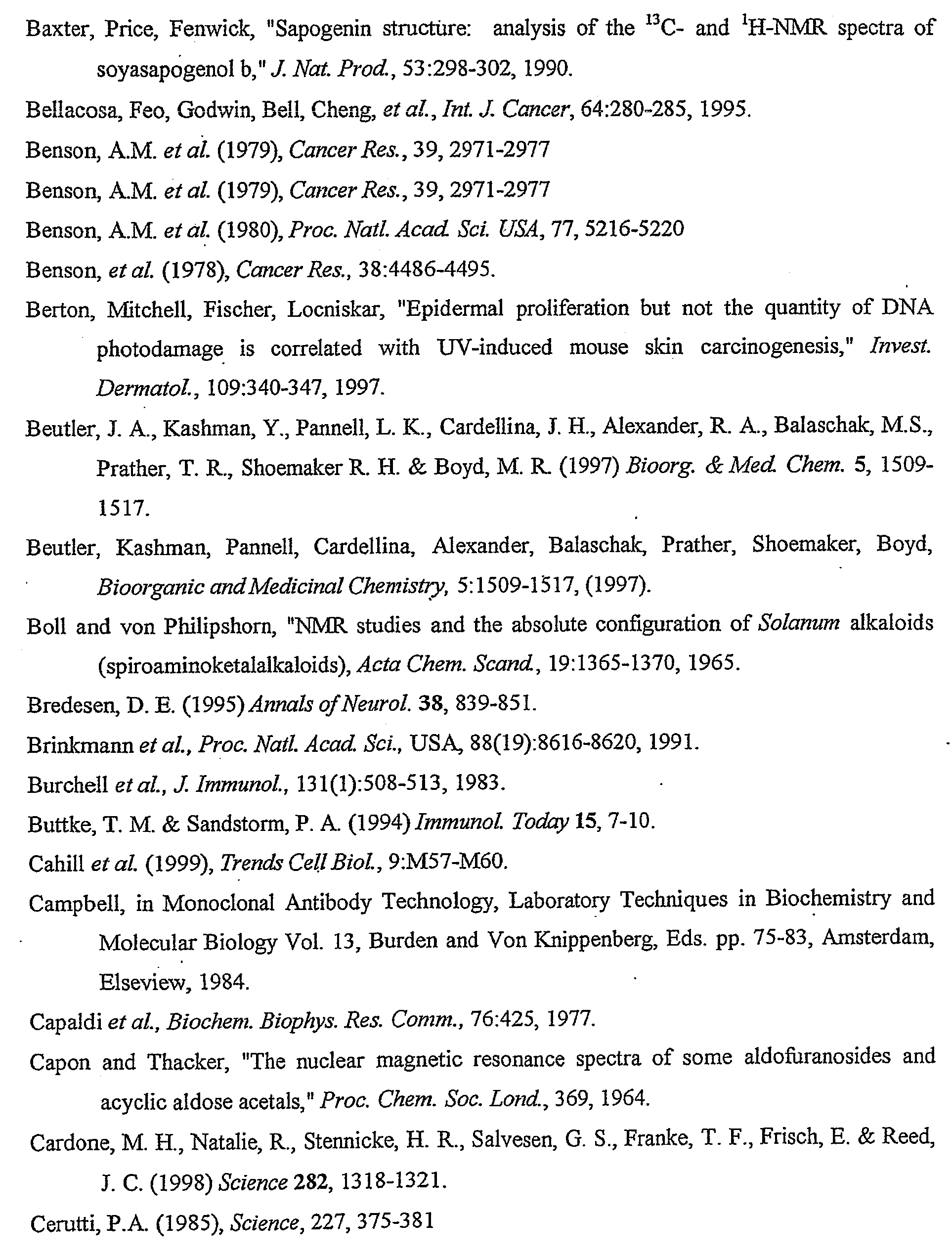 펜타사이클릭 트리테르펜인 베툴린산은 누드 마우스 (nude mouse) 이종조직이식 (xenograft) 모델에서 인간의 흑색종 성장에 대한 선택적 억제제인 것으로 보고되었으며, 세포소멸(apoptosis)을 유도함으로써 세포독성을 야기시키는 것으로 밝혀졌다 (Pisha et al., 1995). 쿠쿠르비타세 (Cucurbitaceae) 과의 한의약용 식물로부터 유래한 트리테르펜 사포닌은 항종양 활성을 나타내었다 (Kong et al., 1993). 트리테르펜의 모노글리코시드는 MOLT-4 인간 백혈병 세포에 대하여 강력하며 선택적인 세포독성을 나타내는 것으로 밝혀졌으며 (Kasiwada et al., 1992), 이리다세 (Iridaceae) 과의 특정한 트리테르펜 글리코시드는 종양의 성장을 억제하고 에를리히 (Ehrlich) 복수암이 이식된 마우스의 수명을 증가시켰다 (Nagamoto et al., 1988). 레구미노세 (Leguminosae) 과에 속하는 식물 돌리코스 팔카투스 (Dolichos falcatus)로부터 유래한 사포닌 제제는 시험관내 및 생체내에서 육종-37 세포에 대해 효과적인 것으로 보고되었다 (Huang et al., 1982). 역시 레구미노세 과로부터 유래한 대두 사포닌은 다수의 종양에 대해 효과적인 것으로 밝혀졌다 (Tomas-Barbaren et al., 1988). 용혈 활성 및 연체동물박멸 활성을 나타내는 올레아놀산 및 집소게닌 글리코시드는 스바르찌아 마다가스카리엔시스 (Swartzia madagascariensis) (Leguminosae)의 지상과일 꼬투리 (ground fruit pod)로부터 분리되었다 (Borel and Hostettmann, 1987).Betulinic acid, a pentacyclic triterpene, has been reported to be a selective inhibitor of human melanoma growth in a nude mouse xenograft model, inducing cytotoxicity by inducing apoptosis. (Pisha et al ., 1995). Triterpene saponins derived from herbal medicines of the Cucurbitaceae family showed antitumor activity (Kong et al ., 1993). Monoglycosides of triterpenes have been shown to exhibit potent and selective cytotoxicity against MOLT-4 human leukemia cells (Kasiwada et al ., 1992), and certain triterpene glycosides with Iridaceae have been shown to inhibit tumor growth. Inhibition and increased lifespan of transplanted mice with Ehrlich ascites cancer (Nagamoto et al ., 1988). Saponin preparations derived from the plant Dolichos falcatus belonging to the Leguminosae family have been reported to be effective against sarcoma-37 cells in vitro and in vivo (Huang et al ., 1982). Soy saponin, also from the Legumino family, has been shown to be effective against many tumors (Tomas-Barbaren et al ., 1988). Oleanoic acid and zipsogenin glycosides exhibiting hemolytic activity and mollusc eradication activity were isolated from ground fruit pods of Swartzia madagascariensis (Leguminosae) (Borel and Hostettmann, 1987).