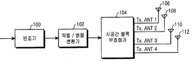 도 1은 종래 기술에 따른 시공간 블록 부호화 방식을 사용하는 무선통신시스템에서 송신기의 구성을 보여주는 도면.1 is a block diagram of a transmitter in a wireless communication system using a space-time block coding scheme according to the prior art.