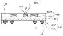 여기서, 절연층(105)은 상기 절연기재(101) 상에 형성되며, 이후 솔더볼과 접합하도록 상기 회로패턴(102A, 102B)을 노출하는 개구부(O, P)를 구비한다. 상기 절연층(105)은 패터닝된 솔더 레지스트로 구성될 수 있다. 여기서, 개구부(O, P)에는 반도체 소자 또는 솔더 볼과의 접속을 위하여 각각 금도금층(107)을 형성한다. 또한, 금과 접착성을 높이기 위하여, 니켈층(106)을 얇게 도금한 후, 금도금층(107)을 형성하는 것이 바람직하다.Here, the insulating
