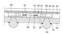 아울러, 패드(141)가 구비된 영역을 제외한 영역, 즉 제2영역(Ⅱ)은 비교적 저렴한 비도전성 재질의 제2접착필름으로 부착하여 제조 비용을 감소시켰다. 또한, 제2영역(Ⅱ)의 일부만을 기판(110)과 접착시켜 반도체 소자(140)와 기판(110)의 접 착 면적을 감소시킴으로써, 반도체 소자(140)와 기판(110)의 열팽창 계수(CTE)의 차이로 인해 반도체 소자(140)와 기판(110) 사이에 박리 현상이 발생하는 것을 방지할 수 있다.In addition, the region except for the region where the