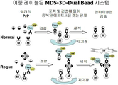 본 발명의 방법으로 MDS-3d-Single Bead 시스템을 실시하는 경우, 바람직하게는 단계 (c)에서 캐리어-포획항체와 캐리어-검출항체의 몰비 5:1-1:5로 동시에 첨가되며, 보다 바람직한 몰비는 3:1-1:3이고, 가장 바람직한 몰비는 2:1이다.When carrying out the MDS-3d-Single Bead system by the method of the present invention, preferably in step (c), the molar ratio of the carrier-capturing antibody and the carrier-detecting antibody is simultaneously added at 5: 1-1: 5, more preferably The molar ratio is 3: 1-1: 3 and the most preferred molar ratio is 2: 1.