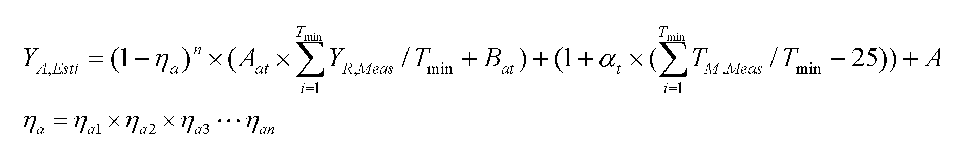 (여기서, IA , Esti : 태양광발전 어레이의 직류전류 추정값, YR , Meas : 태양 등가 가동시간 출력값, Aai 및 Bai : 태양광발전 어레이 직류전류 보정상수, ηa : 태양광발전 어레이 노화계수, ηan : 운전년수별 태양광발전 어레이 노화계수, n : 운전년수, Tmin : 시간 간격(분)) (Where I A , Esti : DC current estimate of photovoltaic array, Y R , Meas : solar equivalent uptime output value, A ai and B ai : photovoltaic array DC current correction constant, η a : photovoltaic array Aging coefficient, η an : photovoltaic array aging coefficient by years of operation, n: years of operation, T min : time interval (minutes))