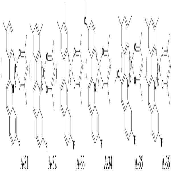 상기 화학식2에 있어, R1 내지 R7의 선택 결과에 따르면, 중앙의 이리듐(Ir) 좌측의 구조는 하기 화학식2에 표시된 다수의 구조 중 어느 하나이다. 하기 화학식2에서 불소(F)원소가 치환된 것을 보여주고 있으나, Cl, Br 등 그 밖의 할로겐 원소로 치환될 수 있다.In the above formula (2), according to the result of the selection of R1 to R7, the structure of the left side of the iridium (Ir) in the center is any one of a plurality of structures shown in the following formula (2). In Formula 2, the fluorine (F) element is substituted, but may be substituted with other halogen elements such as Cl and Br.
