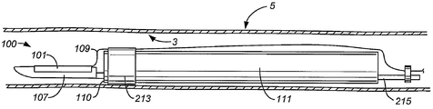 상기 장치는 또한 절제 구조물을 내시경에 결합하기 위해 외측면 위에 펼쳐지도록 하는 시스(sheath)를 포함한다. 시스는 이와 달리 절제 구조물을 내시경으로 결합하도록 할 수 있다. 이러한 실시예에서, 시스는 시스의 근위부(proximal portion)에 형성되는 슬릿을 포함하며, 상기 슬릿은 내시경의 말단부가 시스 내로 들어갈 수 있도록 개방되도록 한다. 또 다른 실시예에서, 시스는 시스의 근위부 보다 더 작은 외경을 구비한 말단 부분(distal portion)을 포함할 수 있으며, 시스의 말단 부분은 내시경이 삽입될 때 확장되도록 한다.The device also includes a sheath that allows the ablation structure to unfold onto the outer surface for engaging the endoscope. SIS, on the other hand, may allow the ablation structure to be coupled to the endoscope. In this embodiment, the sheath includes a slit formed in the proximal portion of the sheath, such that the slit opens to allow the distal end of the endoscope to enter the sheath. In another embodiment, the sheath can include a distal portion having a smaller outer diameter than the proximal portion of the sheath, and the distal portion of the sheath expands when the endoscope is inserted.