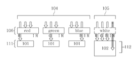 상기 컬러파트(104)의 하부에는 제 1 수광부(101)가 배치되고, 상기 투명파 트(105)의 하부에는 제 2 수광부(102)가 배치된다. 제 1 수광부(101)와 제 2 수광부(102)는 동일한 평면상에 위치하는 것이 가능하다. 제 3 수광부(103)는 제 1 수광부(101) 또는 제 2 수광부(102)의 하부에 배치된다.A first