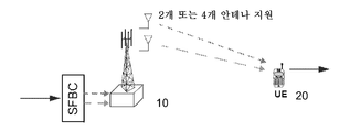도 2b: 기지국(10)에 있는 상이한 안테나들로부터 동일 정보가 전송되는 전송 다이버시티. 이 정보는 각 안테나로부터 상이한 부반송파들을 통해 동일 데이터를 반송하는 심벌들을 전송하기 위해, 아래 약술된 바와 같이 공간 주파수 블록 코딩(Space Frequency Block Coding, SFBC)을 이용하여 각 안테나에서 상이하게 코딩된다. UE(20)에서는 하나의 수신 안테나 포트(Rx 안테나)만이 필요하지만, 성능 개선을 위해 둘 이상의 Rx 안테나가 사용될 수도 있다.2B: Transmit diversity in which the same information is transmitted from different antennas in the