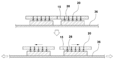 이어서, 서로 적층된 하부칩(10) 및 상부칩(20)을 캐리어(16)로부터 분리한 후, 상부칩(20)의 상면에 신장 가능한 필름(36)을 부착하는 단계와, 스텔스 다이싱에 의하여 서로 분리된 상태인 하부칩(10) 간의 간격이 보다 넓게 이격되도록 필름(36)을 좌우로 잡아당겨 늘려주는 단계가 진행됨으로써, 상부칩(20)들 간의 간격과 하부칩(10)들 간의 간격이 보다 넓어지게 된다.(도 1e 참조)Attaching a
