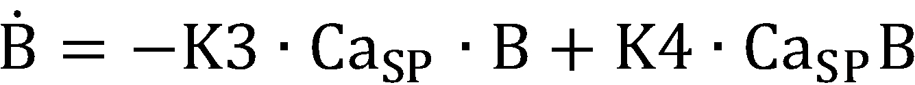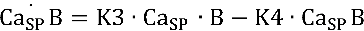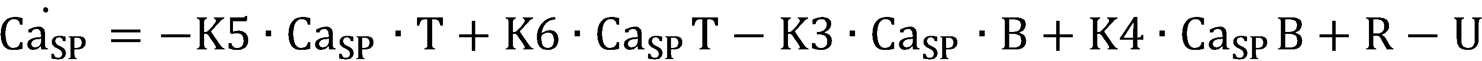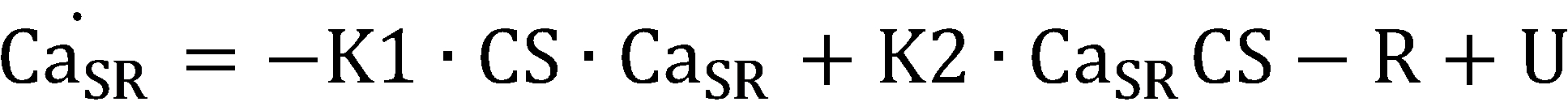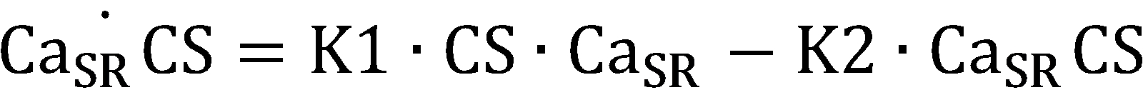 (CaSR: 칼슘 농도, CS: 칼세퀘스트린(calsequestrin), R: 근육 세포질그물로부터 방출되는 Ca2+의 유동율, U: 근육 세포질그물로 흡수되는 Ca2+의 유동율, K1, K2: 화학적 반응 계수, Pmax: 근육 세포질그물로부터 방출되는 최대 투과율(permeability), 및 : 투과율에서 증가 및 감소의 시상수, Umax: 근육 세포질그물로 흡수되는 최대 펌프 속도(pump rate), K: 근육 세포질그물에서 펌프를 활성화하는 Ca2+에 대한 사이트 결합 계수, B: 근육 세포질에서 자유 완충 물질, T: 근육 세포질에서 트로포닌(troponin), K3 및 K4: Ca2+ 및 Ca2+와 결합한 버퍼(CaSPB) 사이의 진행 및 역행에 대한 화학적 반응 계수, K5 및 K6: Ca2+ 및 Ca2+과 결합한 트로포닌(CaSPT) 사이의 진행 및 역행에 대한 화학적 반응 계수, K6: 근육 세포 활성화(A)의 함수(K6, 는 초기 화학적 반응 계수))(Ca SR : calcium concentration, CS: calsequestrin, R: flow rate of Ca 2+ released from muscle cytoplasmic net, U: flow rate of Ca 2+ absorbed into muscle cytoplasmic net, K1, K2: chemical reaction Coefficient, P max : maximum permeability emitted from the muscle cytoplasmic net, And : The time constant of increase and decrease in permeability, U max : maximum pump rate absorbed into the muscle cytoplasmic net, K: site binding coefficient to Ca 2+ activating the pump in the muscle cytoplasmic net, B: Free response substance, T: chemical reaction coefficient for progression and regression between troponin in the myocyte cytoplasm, K3 and K4: buffer bound with Ca 2+ and Ca 2+ (Ca SP B), K5 and K6: Ca 2+ and Ca 2+ and bound troponin (Ca T SP) and the reaction progress coefficients for regression, K6 between: the function of the muscle cell activation (a) (K6 , Initial chemical reaction coefficient)