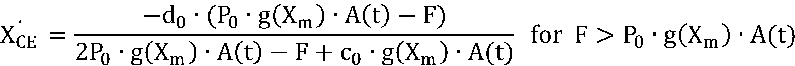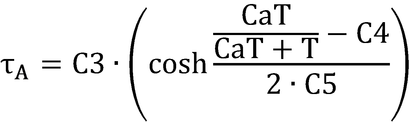 ( 및 , C1: 근육의 반 활성화(half muscle activation)를 생성하는 Ca2+-결합 트로포닌의 정규화된 농도, C2: C1에서 활성화 곡선의 기울기이며, C3: 온도에 대한 환산 계수(scaling factor), C4: 최대 시상수에서 Ca2+-결합 트로포닌의 정규화된 농도, C5: 곡선의 기울기 결정)( And , C2 is the slope of the activation curve at C1, C3 is the scaling factor for temperature, C4 is the normalized concentration of Ca2 + -binding troponin that produces half muscle activation, : Normalized concentration of Ca 2+ -conjugated troponin at maximum time constant, C5: slope determination of curve)