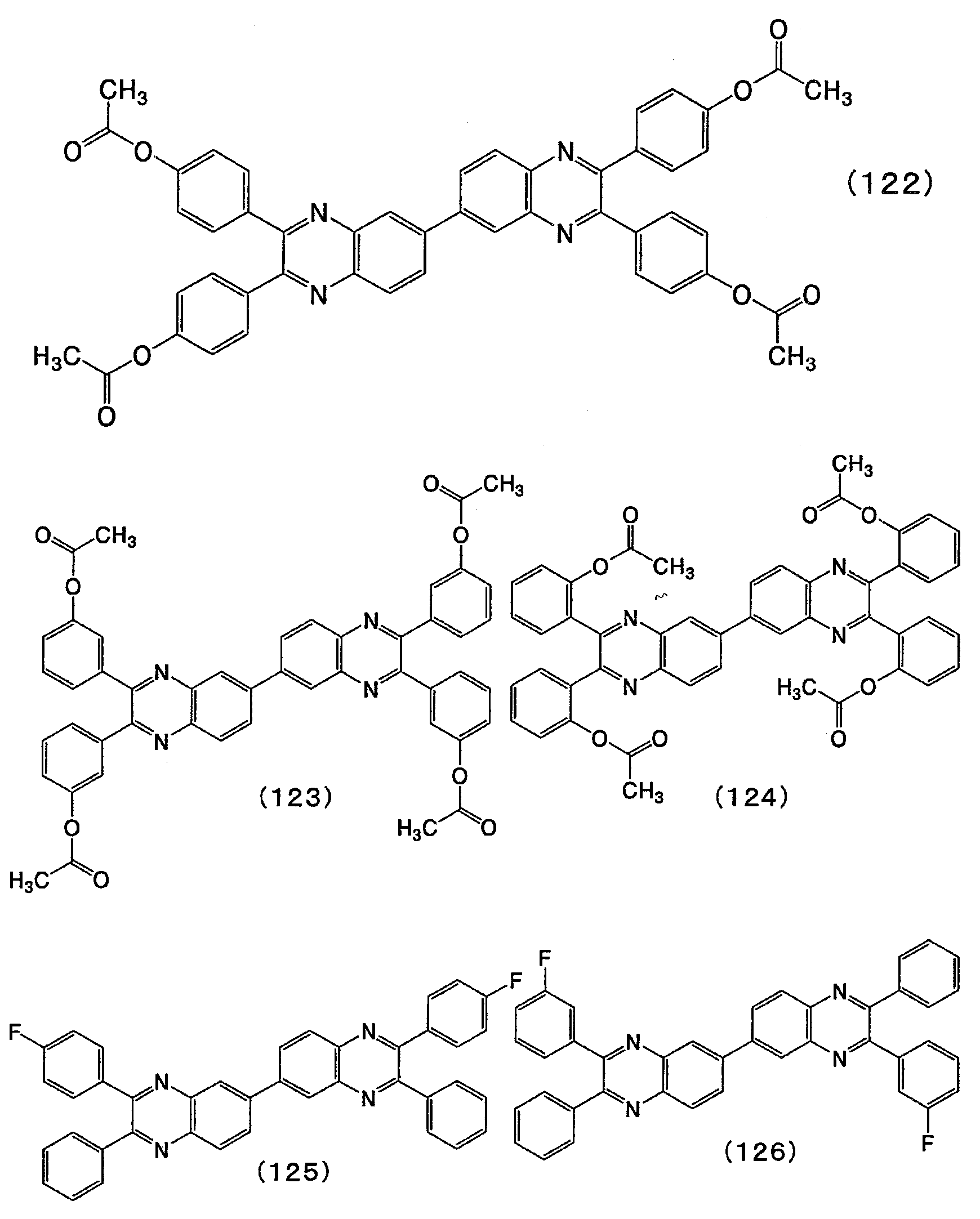 2,3,2',3'-테트라페닐-6,6'-비퀴녹살린 유도체로서는, 페닐 그룹이 전자 흡인 그룹(플루오로 그룹, 시아노 그룹, 트리플루오로메틸 그룹, 니트로 그룹, 아실 그룹, 아실옥시 그룹 등)으로 치환되어 있는 2,3,2',3'-테트라페닐-6,6'-비퀴녹살린 유도체가 비교적 높은 전자 트랩성 및 분자량을 갖는 것을 본 발명자들은 밝혀냈다. 따라서, 본 발명의 양태에 따라서, 상기 발광 소자에서, 상기 제2 유기 화합물은 화학식 1로 나타내어지는 퀴녹살린 유도체이다. 또한, 화학식 1로 나타내어지는 퀴녹살린 유도체는 본 발명자들이 개발한 신규한 물질이며, 본 발명에 포함된다.As the 2,3,2 ', 3'-tetraphenyl-6,6'-biquinoxaline derivative, it is preferable that the phenyl group is an electron withdrawing group (fluoro group, cyano group, trifluoromethyl group, nitro group, , Acyloxy group, etc.) have relatively high electron trapping properties and molecular weight, the inventors of the present invention have found that the 2,3,2 ', 3'-tetraphenyl-6,6'-biquinoxaline derivative substituted with Therefore, according to an embodiment of the present invention, in the light emitting device, the second organic compound is a quinoxaline derivative represented by the general formula (1). The quinoxaline derivative represented by the formula (1) is a novel substance developed by the present inventors and is included in the present invention.