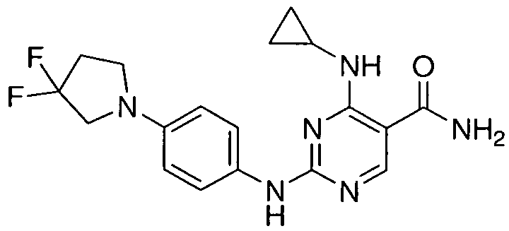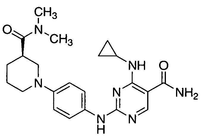 이 분석에서 JAK3의 촉매적 활성에 대한 화합물의 효과를 직접적으로 측정하였다. 정제 인간 JAK3 (진뱅크 (GenBank) AF513860) 서열 (잔기 781 - C 말단)을 곤충 세포로부터 얻었다. ATP의 촉매적 가수분해를 방사측정 필터 결합 방법을 이용하여 측정하였다. 33[P]ATP 및 기질과 함께 키나제를 인큐베이션하여 33[P]를 기질로 도입시키고, 이어서 이를 여과에 의해 다른 반응 성분으로부터 분리할 수 있었다. 분석은 1, 0.3 또는 0.1 μM 화합물의 존재 또는 부재하에 10 μM ATP를 사용하여 수행하였다. 활성은 제어의 억제율 (%)로 표현하였다.