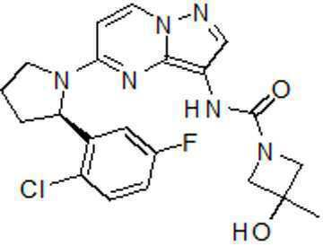 - RGRAMUBKXXUKIF-DOTOQJQBSA-N (3S)-N-[5-[(2R)-2-(5-fluoro-2-methoxyphenyl)pyrrolidin-1-yl]pyrazolo[1,5-a]pyrimidin-2-yl]-3-hydroxypyrrolidine-1-carboxamide Chemical compound FC=1C=CC(=C(C=1)[C@@H]1N(CCC1)C1=NC=2N(C=C1)N=C(C=2)NC(=O)N1C[C@H](CC1)O)OC RGRAMUBKXXUKIF-DOTOQJQBSA-N 0.000 claims description 4