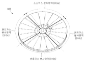 샤워헤드에 구비되는 복수개의 가스분사영역(310)은, 소스가스->퍼지가스->반응가스->퍼지가스의 순서로 분사하는 가스분사영역들이 배치된다. 즉, 소스가스 분사영역, 퍼지가스 분사영역, 반응가스 분사영역으로 된 복수개의 가스분사영역(310)을 구비하여 이들 가스분사영역이 가스분사장치인 샤워헤드의 둘레를 따라 방사형으로 배치되도록 한다.The plurality of gas injection regions 310 provided in the shower head are arranged in such a manner that the gas injection regions inject in the order of source gas -> purge gas -> reactive gas -> purge gas. That is, a plurality of gas injection regions 310, which are a source gas injection region, a purge gas injection region, and a reaction gas injection region, are provided so that these gas injection regions are radially arranged along the periphery of the shower head as the gas injection device.