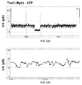 도 11. TrwC (Afe) (서열 86) 헬리카제를 사용한 헬리카제 제어된 DNA 이동을 나타내는 전류 트레이스의 예. 하부 트레이스는 헬리카제 제어된 DNA 이동의 확장된 영역을 나타낸다.