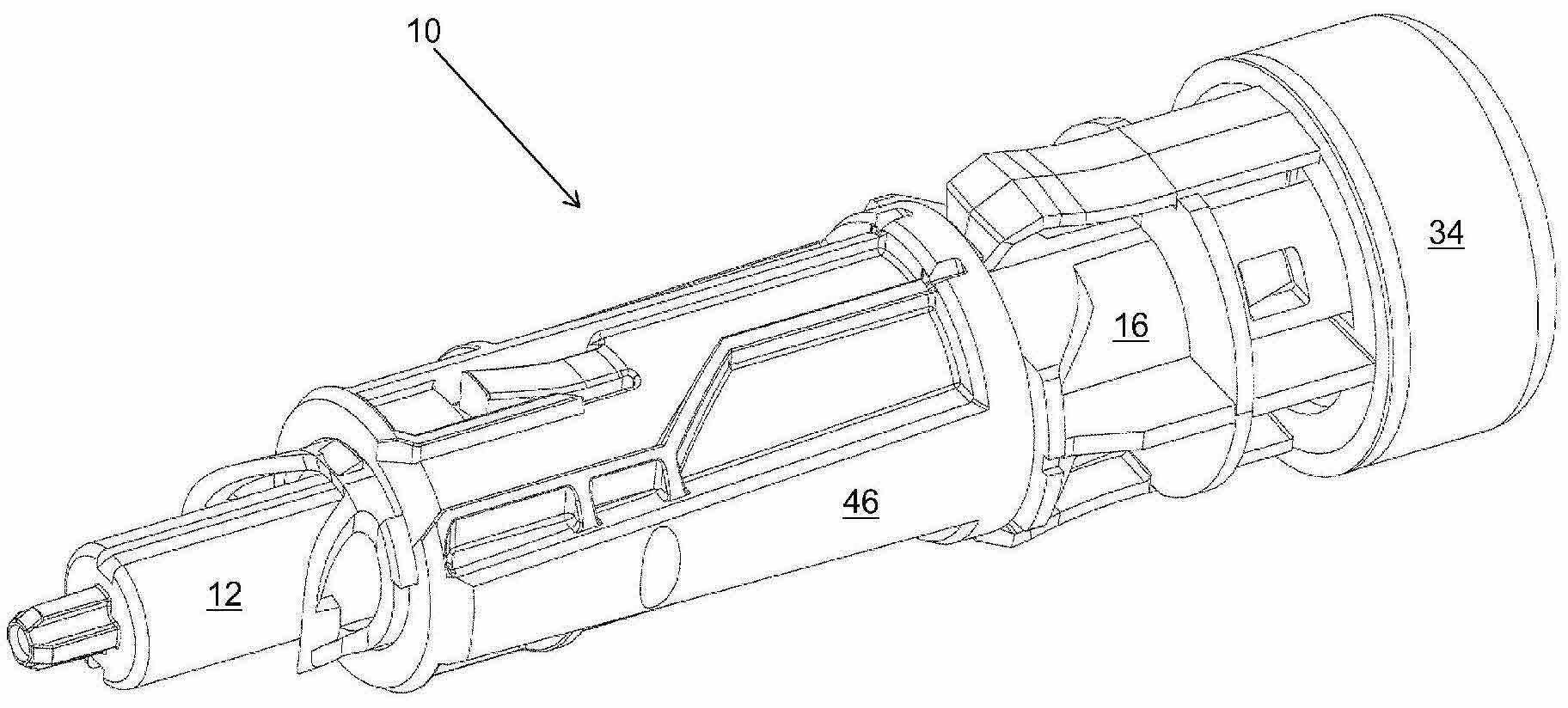 플런저 로드를 유지하기 위한 양호한 그립(grip)을 제공할 뿐만 아니라 명확하고 분명한 신호를 제공하기 위해서, 유지 요소는 대체로 종 방향으로 연장하는 가요성 아암을 포함할 수 있으며, 아암에는 플런저 로드의 리세스와 맞물리도록 설계된 렛지(ledge)가 배열될 수 있으며, 렛지는 신호 개시 요소와 협동하도록 배열된다. 또한, 신호 발생 요소는 적어도 하나의 열로 종 방향으로 서로 줄지어 배치된 복수의 기계적인 가요성 요소를 포함할 수 있다. 이러한 해결책에 의해서, 신호 발생 요소의 수는 신호 개시 요소의 수보다 더 많으며, 이는 신호 발생 요소의 열을 통과하고 접촉할 때 신호를 발생하기 위해 단지 하나의 돌기만을 요구한다.In order to provide a clear and clear signal as well as to provide a good grip for holding the plunger rod, the retaining element may comprise a flexible arm extending generally longitudinally, the arm having a recess of the plunger rod and A ledge designed to engage may be arranged, the ledge being arranged to cooperate with the signal initiating element. Further, the signal generating element may include a plurality of mechanically flexible elements arranged in line with each other in the longitudinal direction in at least one row. With this solution, the number of signal generating elements is more than the number of signal initiating elements, which requires only one protrusion to generate a signal when passing through and contacting the row of signal generating elements.