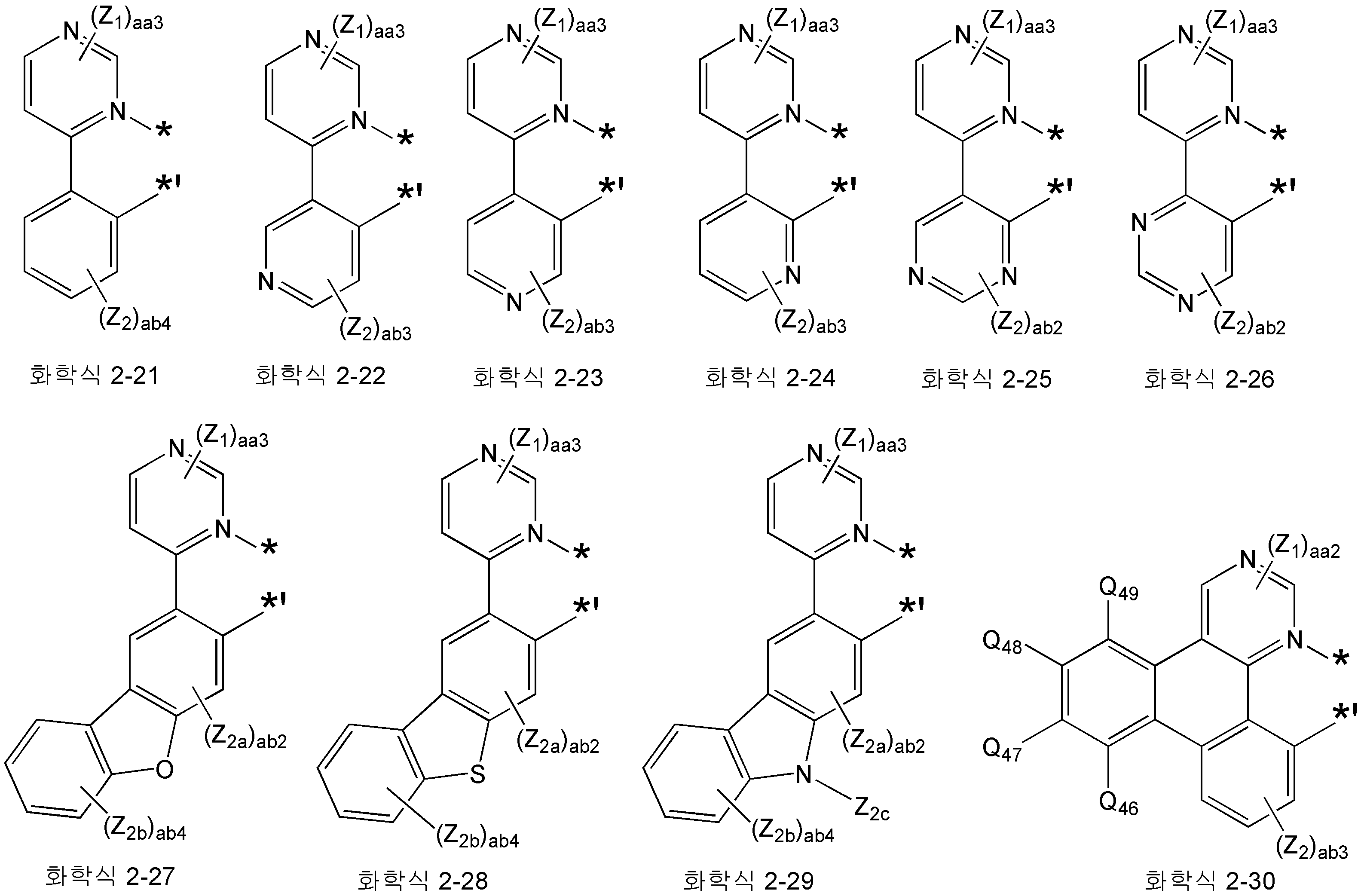상기 화학식 2A 및 2B 중 Z1, Z2 및 R11 내지 R14은 서로 독립적으로, 수소, 중수소, -F, -Cl, -Br, -I, -SF5, 히드록실기, 니트로기, 아미노기, 아미디노기, 히드라진기, 히드라존기, 카르복실산 또는 이의 염, 술폰산 또는 이의 염, 인산 또는 이의 염, 치환 또는 비치환된 C1-C60알킬기, 치환 또는 비치환된 C2-C60알케닐기, 치환 또는 비치환된 C2-C60알키닐기, 치환 또는 비치환된 C1-C60알콕시기, 치환 또는 비치환된 C3-C10시클로알킬기, 치환 또는 비치환된 C1-C10헤테로시클로알킬기, 치환 또는 비치환된 C3-C10시클로알케닐기, 치환 또는 비치환된 C1-C10헤테로시클로알케닐기, 치환 또는 비치환된 C6-C60아릴기, 치환 또는 비치환된 C6-C60아릴옥시기, 치환 또는 비치환된 C6-C60아릴티오기, 치환 또는 비치환된 C1-C60헤테로아릴기, 치환 또는 비치환된 1가 비-방향족 축합다환 그룹, 치환 또는 비치환된 1가 비-방향족 헤테로축합다환 그룹, -N(Q1)(Q2), -Si(Q3)(Q4)(Q5), -B(Q6)(Q7) 및 -P(=O)(Q8)(Q9) 중에서 선택되고, In Formulas 2A and 2B, Z 1 , Z 2 , and R 11 to R 14 may each independently represent hydrogen, deuterium, -F, -Cl, -Br, -I, -SF 5 , a hydroxyl group, a nitro group, or an amino group , amidino group, hydrazine group, hydrazone group, carboxylic acid or a salt thereof, sulfonic acid or a salt thereof, phosphoric acid or a salt thereof, a substituted or unsubstituted C 1 -C 60 alkyl group, a substituted or unsubstituted C 2 -C 60 Alkenyl group, substituted or unsubstituted C 2 -C 60 alkynyl group, substituted or unsubstituted C 1 -C 60 alkoxy group, substituted or unsubstituted C 3 -C 10 cycloalkyl group, substituted or unsubstituted C 1 - C 10 heterocycloalkyl group, substituted or unsubstituted C 3 -C 10 cycloalkenyl group, substituted or unsubstituted C 1 -C 10 heterocycloalkenyl group, substituted or unsubstituted C 6 -C 60 aryl group, substituted or Unsubstituted C 6 -C 60 aryloxy group, substituted or unsubstituted C 6 -C 60 arylthio group, substituted or unsubstituted C 1 -C 60 heteroaryl group, substituted or unsubstituted monovalent non-aromatic group Condensed polycyclic group, substituted or unsubstituted monovalent non-aromatic condensed heteropolycyclic group, -N(Q 1 )(Q 2 ), -Si(Q 3 )(Q 4 )(Q 5 ), -B(Q 6 ) )(Q 7 ) and -P(=O)(Q 8 )(Q 9 ),