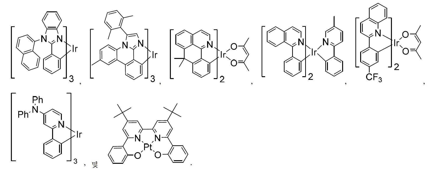 OLED는 디바이스를 가로질러 전압을 인가할 때 광을 방출하는 유기 박막을 사용한다. OLED는 평면 패널 디스플레이, 조명 및 백라이팅(backlighting)과 같은 적용예의 용도에 있어 점차로 중요해지는 기술이다. 여러가지의 OLED 재료 및 구성은 미국 특허 제5,844,363호, 제6,303,238호 및 제5,707,745호에 기재되어 있으며, 이들 특허 문헌은 그 전문이 본원에 참고로 포함된다. OLEDs use organic thin films that emit light when a voltage is applied across the device. OLEDs are an increasingly important technology for use in applications such as flat panel displays, lighting and backlighting. A variety of OLED materials and constructions are described in U.S. Pat. Nos. 5,844,363, 6,303,238, and 5,707,745, all of which are incorporated herein by reference in their entirety.