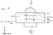도 6a는 본 발명의 예들에 따른, 물이 존재하는 상태의 기호로 표시된 전단파 변환기 구현예를 예시한다.