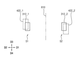 예시적인 실시예들에 있어서, 상기 상부 기판의 상기 상면에 수직한 방향에서 볼 때, 상기 제5 개구와 상기 제7 개구가 중첩된 제3 형상과 상기 제6 개구와 상기 제8 개구가 중첩된 제4 형상은 상기 가상선 에 대하여 대칭일 수 있다.In exemplary embodiments, when viewed in a direction perpendicular to the upper surface of the upper substrate, the third shape in which the fifth opening and the seventh opening overlap and the fourth shape in which the sixth opening and the eighth opening overlap may be symmetrical with respect to the virtual line.
