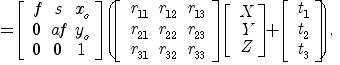 여기에서 u는 x를 단일 좌표(Homogeneous Coordinates)로 표시한 벡터이고, K는 카메라 교정 행렬(Camera Calibration Matrix)로써, 카메라 좌표계 상에서 3D(3차원) 포인트와 그것이 투영되어 얻어진 이미지 면에서의 2D(2차원) 포인트와의 관계를 나타내고, R과 t는 카메라의 회전 행렬(Rotation Matrix)과 트렌스레이션 벡터(Translation Vector)로써, 월드 좌표계와 카메라 좌표계 사이의 변환 관계 를 나타낸다. 행렬 K에 포함되어 있는 파라메타들을 카메라의 내부 파라메타(Internal Parameter)라고 부르는데, f는 초점거리(Focal Length), a는 픽셀의 종횡비(Aspect Ratio), s는 스큐(Skew), (xc,yc)는 주된 점(Principal Point)를 나타낸다.Where u is a vector representing x in Homogeneous Coordinates, K is a Camera Calibration Matrix, which is a 3D (three-dimensional) point on the camera coordinate system and the 2D ( 2D) represents a relationship with a point, and R and t are a rotation matrix and a translation vector of a camera, and represent a transformation relationship between a world coordinate system and a camera coordinate system. Parameters contained in matrix K This parameter is called an internal parameter, where f is the focal length, a is the aspect ratio of the pixels, s is the skew, and (x c , y c ) is the principal point. .