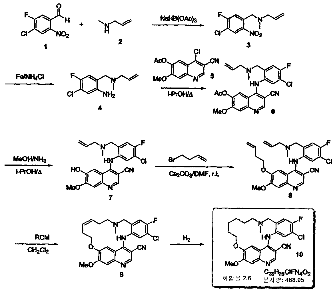 또한, EGF 수용체 티로신 키나제 저해제가 인간 젖샘 암종 또는 인간 편평세포암종 등의 암종이 이식된 가슴샘 없는 생쥐에 있어서 성장이 특히 감쇠된다고 하는 입증에 의해 뒷받침되고 있다(T. R Burke Jr.에 의한 논문, Drugs of the Future, 1992, 17, 119). 그 결과, EGFR 수용체를 표적으로 하는 상이한 암을 치료하기 위한 약물의 개발에 있어서 상당히 주목받고 있다. 예를 들어, EGFR의 세포외 영역에 결합된 수개의 항체들은 임콜론 시스템즈사(Imclone Systems)에 의해 개발되었고 수개의 암의 치료에 대한 대량 임상시험단계(phase III)에 있는 Erbituxw™(C225로도 불리고 있음, Cetuximab)을 포함해서 임상 시험되고 있다. 또한, EGFR 티로신 키나제의 강력하고 비교적 특이적인 저해제인 수개의 촉망받는 경구 활성 약물들도 현재 임상 시험이 진행중에 있다. 또, 현재 IRESSA®(이레사)로도 불리며 진전된 비소세포 폐암의 치료용으로 승인받은 AstraZeneca 화합물 ZD1839 및 현재 Tarceva™(타세바)(엘로티닙)로 불리는 OSI/Genentech/Roche 화합물 OSI-774는 인간 임상시험에 있어서 수개의 암에 대해 현저한 효능을 보이고 있다(Morin M.J., "From oncogene to drug: development of small molecule tyrosine kinase inhibitors as anti-tumour and anti-angiogenic agents", 2000, Oncogene 19, 6574). In addition, EGF receptor tyrosine kinase inhibitors are supported by evidence that growth is particularly attenuated in mammary gland mice transplanted with carcinomas such as human mammary gland carcinoma or human squamous cell carcinoma (T. R Burke Jr., Drugs of the Future, 1992, 17, 119). As a result, considerable attention is paid to the development of drugs for treating different cancers that target the EGFR receptor. For example, several antibodies bound to the extracellular domain of EGFR were developed by Imclone Systems and are in the phase III phase of Erbituxw ™ (C225) for the treatment of several cancers. In clinical trials, including Cetuximab). In addition, several promising orally active drugs that are potent and relatively specific inhibitors of EGFR tyrosine kinases are currently in clinical trials. The AstraZeneca Compound ZD1839 and OSI / Genentech / Roche Compound OSI-774, now called IRESSA ® (Iresa) and now approved for the treatment of advanced non-small cell lung cancer, are now called human clinical trials. Has shown significant efficacy against several cancers (Morin MJ, "From oncogene to drug: development of small molecule tyrosine kinase inhibitors as anti-tumour and anti-angiogenic agents", 2000, Oncogene 19, 6574).