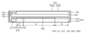 이때, 상기 도광판(220)은 메인 표시 영역(A) 뿐만 아니라 섹션 표시 영역(B)에도 광을 공급할 수 있도록 섹션 표시 영역(B)까지 연장 형성된다. 따라서, 광원(210)에서 출사된 광이 액정 표시 패널(100)의 메인 표시 영역(A)을 투과할 뿐만 아니라 섹션 표시 영역(B)의 제 2 편광판(500b)에 반사될 수 있게 한다. 따라서, 제 2 편광판(500b)에 반사된 빛이 액정 표시 패널(100)의 섹션 표시 영역(B)을 투과하여 어두운 곳에서도 섹션 표시 영역(B)이 보일 수 있도록 한다.In this case, the