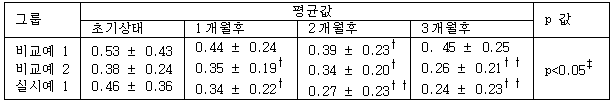 표 2에서 볼 수 있는 바와 같이, 비교예1의 경우 실험 2개월후에 일시적으로 치은염완화가 나타났으나 최종 3개월후에 초기상태와 차이가 없는 것으로 나타났다. 그러나 비교예 2 및 실시예 1에서는 1개월 후부터 치은염 완화효과가 나타났으며, 최종 3개월 후에도 치은염 완화효과가 지속적으로 나타나고 있음을 볼 수 있다. 또한 2개월 후에는 1개월이 지난 후보다도 더욱 유의한 치은염 완화 효과가 있음을 볼 수 있다(p<0.01). As can be seen in Table 2, in the case of Comparative Example 1, gingival inflammation temporarily appeared after 2 months of experiment, but there was no difference from the initial state after the last 3 months. However, in Comparative Example 2 and Example 1, the gingivitis mitigating effect appeared after one month, and it can be seen that the gingivitis mitigating effect continued to appear even after the last three months. In addition, two months later, the gingivitis mitigation effect was more significant than one month later (p <0.01).