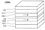 도10은 상부 및 하부 핀 고정될 층이 양쪽 모두 합성 핀 고정 구조를 갖는 자기-저항 피막의 구조 예를 도시하는 사시도.Fig. 10 is a perspective view showing a structural example of a magnetoresistive film in which the upper and lower pinned layers both have a composite pinning structure.