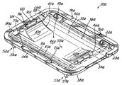도 1 및 도 2를 참조하면, 팬(20)의 한가지 양태는 대향하는 측면 가장자리(22, 24) 및 대향하는 말단(26, 28)을 갖는다. 팬의 주변부(periphery)는 일반적으로 평행인 측면 가장자리(22, 24)와 일반적으로 평행인 말단(26, 28)에 의해 한정된다. 말단(26, 28)은 측면 가장자리(22, 24)에 대해 일반적으로 수직이므로, 팬(20)은 특히 직사각형인 사변형을 갖는다. 주변부 가장자리 면(30, 31)은 측면 가장자리(22, 24)의 실제 크기 및 말단(26, 28)의 일부를 따라 연장된다. 중심에 위치한 공간(32, 34)은 각각의 말단(26, 28)에 위치하며, 대향하는 가장자리 면(30, 31)을 가로막고 있다. 1 and 2, one aspect of the