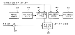 또, 상기 가변길이 복호화용의 테이블은, 각각 적어도 1개 이상의 코드 테이블 및 VLC 테이블을 갖고, 상기 테이블 선택 단계에서는, 상기 예측값에 기초하여 상기 코드 테이블 및 상기 VLC 테이블을 선택하고, 상기 가변길이 복호화 단계에서는, 상기 테이블 선택 단계에 의해 선택된 상기 VLC 테이블을 참조하여, 상기 복호화 대상 블록 중에 포함되는 0 이외의 계수의 개수의 가변길이 부호를 코드 번호로 변환하고, 상기 테이블 선택 단계에 의해 선택된 상기 코드 테이블을 참조하여, 상기 코드 번호를 상기 계수의 개수로 변환하는 것을 특징으로 한다.The variable length decoding table has at least one code table and a VLC table, respectively. In the table selection step, the code table and the VLC table are selected based on the predicted value, and the variable length decoding is performed. In the step, the variable length code of the number of coefficients other than 0 included in the decoding object block is converted into a code number by referring to the VLC table selected by the table selecting step, and the code selected by the table selecting step The code number is converted into the number of coefficients by referring to a table.