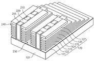 본 다른 실시예의 패터닝 방법에 있어서, 상기 도전막들 사이에 플레이트 형태를 가진 절연막들을 형성하는 것을 더 포함할 수 있다. 상기 순차 확대된 마스크를 이용한 에칭으로 상기 절연막들을 상기 플레이트 형태에서 계단형 형태로 형성할 수 있다.In the patterning method of another exemplary embodiment, the method may further include forming insulating layers having a plate shape between the conductive layers. The insulating layers may be formed in a stepped shape in the form of a plate by etching using the sequentially enlarged mask.