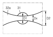 도 3a 및 도 3b에 나타낸 구조에서는 브리지(32a, 32b)의 폭(Dx)가 순차적으로 변화하는 구조를 나타내었으며, 도 3c에서는 브리지(32c)가 단차를 지닌 형태로 형성된 구조를 나타내었다. In the structure shown in FIGS. 3A and 3B, the width Dx of the